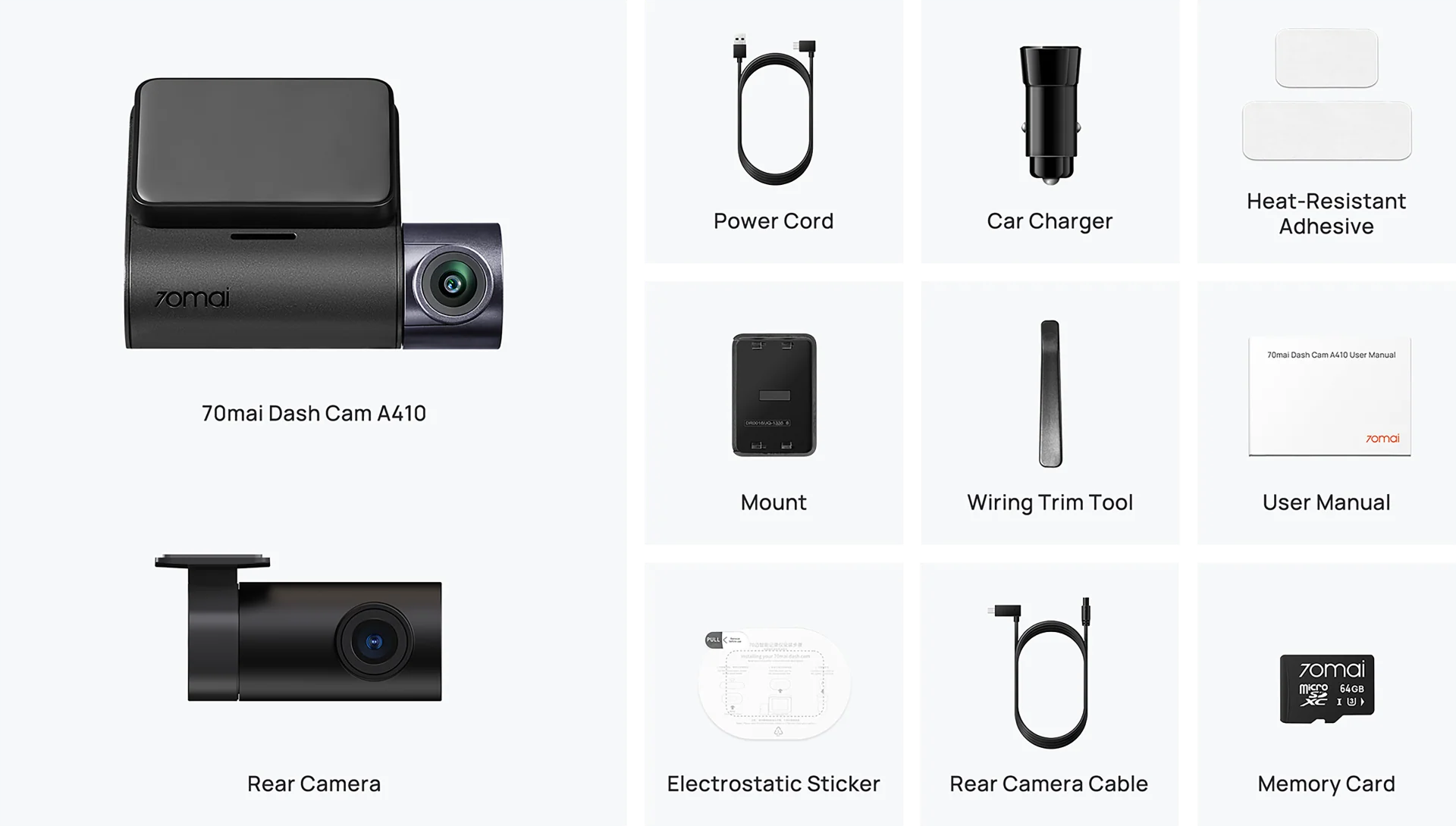 Precio incluye: 1 dashcam delantera 70mai A410, cableado de energia, conector para carro, cableado para camara trasera, camara trasera, adesivo resistente al calor, sticker elextroestatico, memoria MicroSD 64GB y envio gratis a toda Guatemala. Hasta 3 cuotas precio de contado.